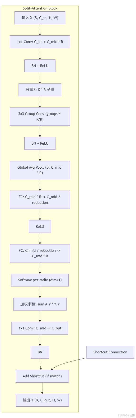 由浅入深,首先理解设计动机:传统ResNet的瓶颈块(Bottleneck)通过1x1-3x3-1x1卷积提取特征,但通道间交互静态,忽略了输入依赖的动态调整。Split-Attention解决此问题,通过“分离”(split)特征为多个路径,独立提取,然后“注意力”(attention)融合。