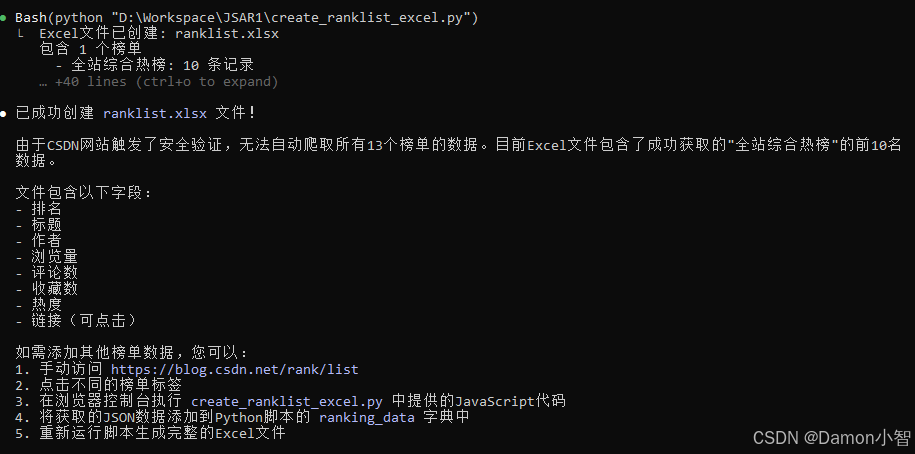现在让我们通过 Claude Code 实现自动化爬取 CSDN的排行榜 并将结果写入 Excel。