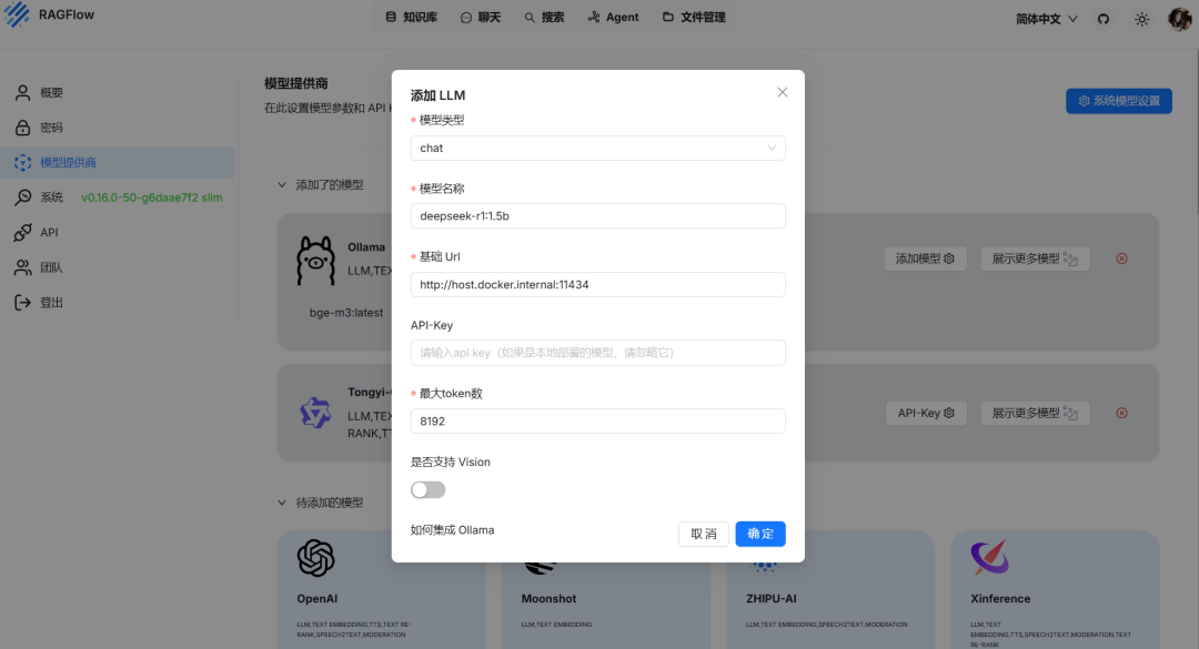 5.最大 token 数可随便填写(本地部署不消耗在线 token)。6.按照上述方法分别添加 chat 模型