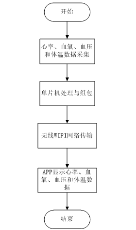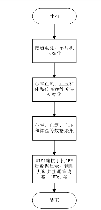 人体健康检测系统的主程序从上电开始,首先插上电源并打开开关上电,系统进行初始化,完成初始化后数据采集单元则开始对人体的健康数据进行采集并负责上传;而作为数据处理及控制核心的STM32单片机则负责对采集数据进行比对并下达控制指令,同时通过无线WiFi模块上传数据到手机APP,完成显示;系统会依据心率、血氧、血压和体温的越限值来决定是否开蜂鸣器和LED灯报警。主程序流程设计如下图所示。