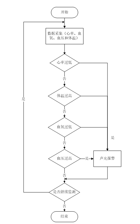 人体健康检测系统采集的数据包括四种,分别由如下的三种传感器来完成,一是人体健康的心率和血氧数据,由心率血氧传感器采集;二是人体健康的血压数据,由血压传感器来采集;三是人体健康的体温数据,由温度传感器采集;通过以上四种人体健康数据的采集为LED灯、蜂鸣器的自动控制提供判定依据。当人体的心率血氧、血压或体温任一数据越限后,自动开启蜂鸣器和led灯报警。人体健康数据采集与控制功能模块设计流程如下图所示。
