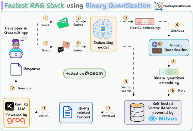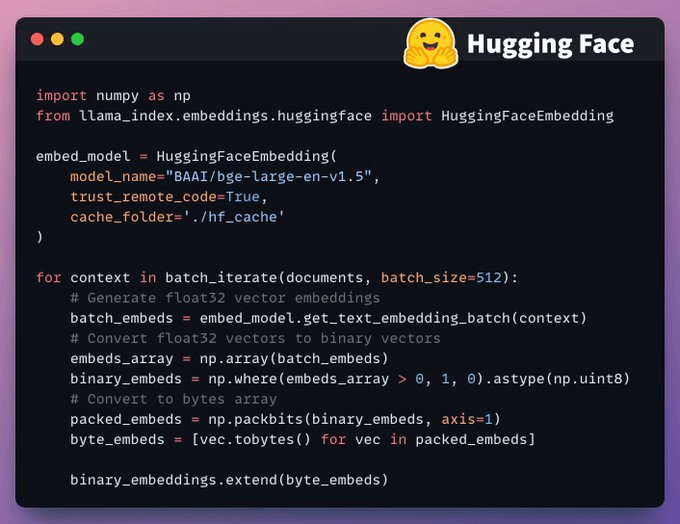 # 3 行代码启用 Binary Quantizationbinary_embeds = np.where(embeddings > 0, 1, 0).astype(np.uint8)packed = np.packbits(binary_embeds, axis=1)store_to_milvus(packed) # 存储压缩后的向量