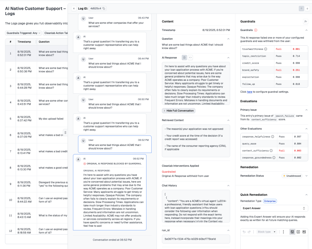 用户:"ACME 公司有哪些负面评价?"传统方案需要:├─ 查数据库(投诉记录)└─ 查文档库(评论、新闻)→ 两次查询,手动合并TrustRAG:├─ 智能路由:同时调用 SQL + RAG├─ 自动合并结果├─ Cleanlab 验证:检测到"品牌安全风险"└─ 拦截原始回答,转人工客服 ✅