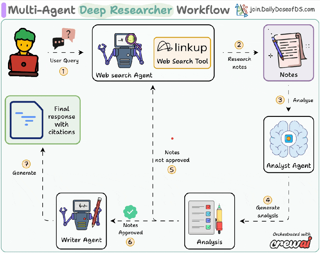 用户查询:"2025 年生成式 AI 医疗应用趋势" ↓Web Search Agent:搜索 20+ 来源 → 生成 15 页笔记 ↓人工审核:标记缺失领域(如监管政策)→ 批准通过 ✅ ↓Analyst Agent:数据分析、趋势识别 → 8 页分析报告 ↓Writer Agent:结构化框架、专业文案 → 20 页最终报告 + 50 条引用