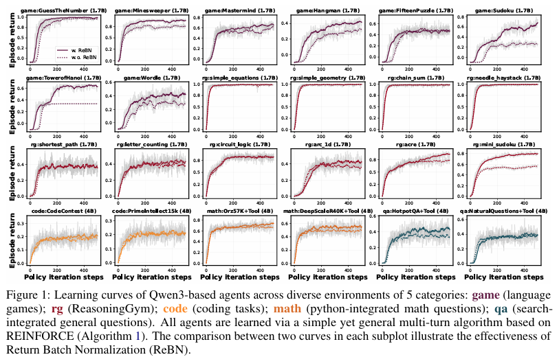 特别地,针对多轮交互中的信用分配问题,提出了一种基于回报批归一化(ReBN)的REINFORCE变体,显著提高了算法在多轮任务上的性能。
