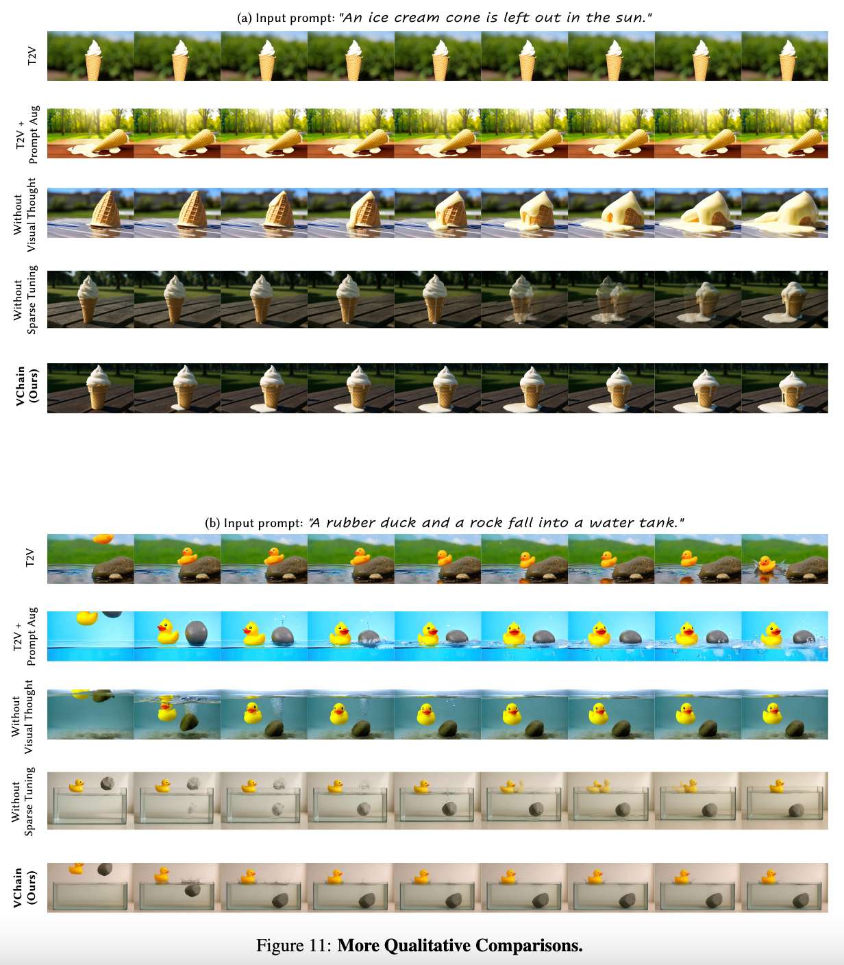 虽然 VChain 主要旨在增强视频生成中的高层推理能力(例如常识、因果关系和物理规律),但表 1 中的结果表明,它并不会削弱基本的视觉质量。事实上,它常常带来一定的改进。