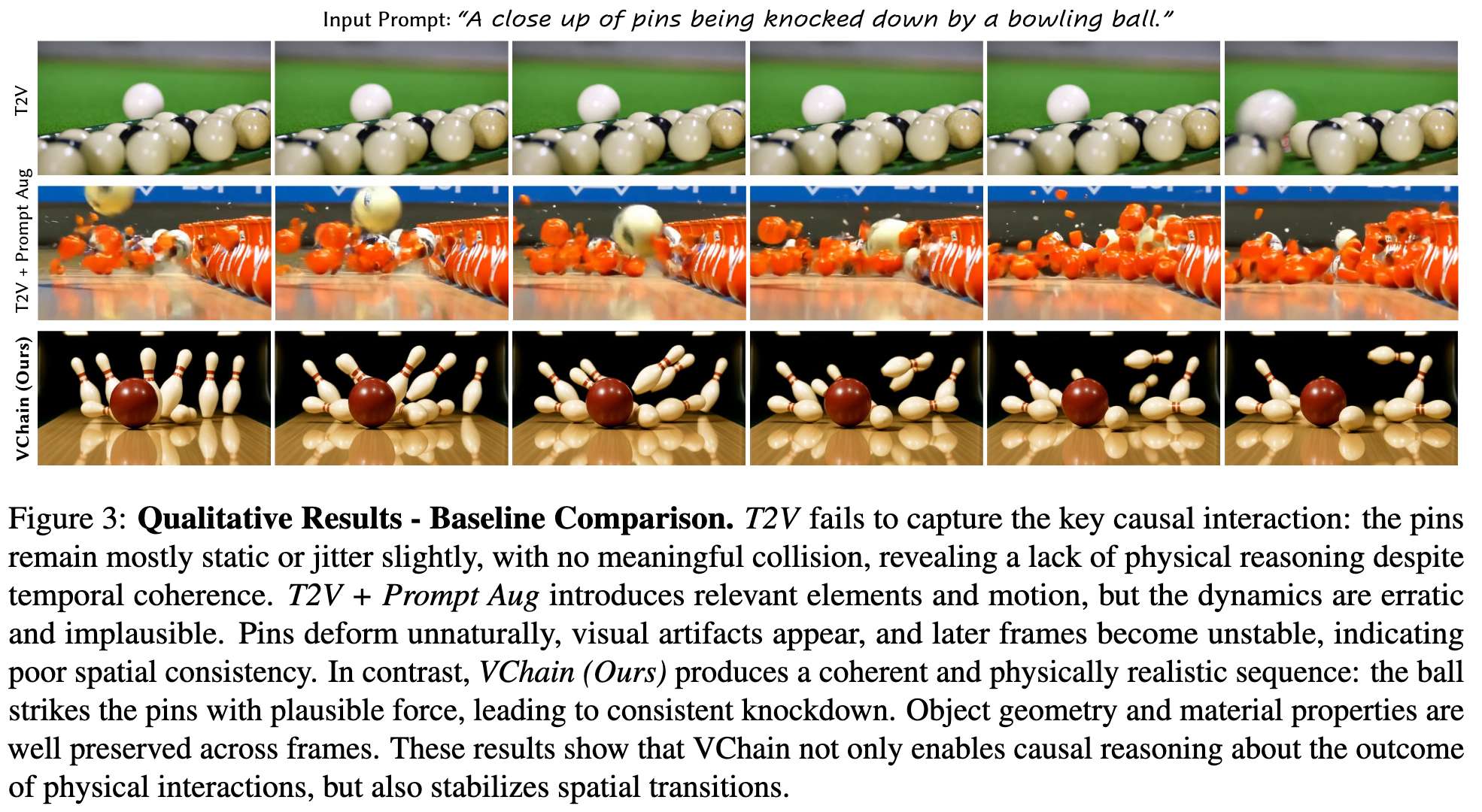 基线比较。 在下图 3 中展示了与基线方法的定性比较。在 T2V 基线中,模型未能产生任何有意义的物理交互:球瓶大多保持静止或仅表现出轻微抖动,没有可见的撞击或倒下。尽管在时间上稳定,但输出与输入提示在语义上不一致,缺乏保龄球击倒球瓶这一关键因果事件。T2V + Prompt Aug 变体引入了球和球瓶,表现出一定程度的碰撞与运动。然而,其动态表现混乱且不符合物理规律。球瓶出现不合理的变形或散落,场景还存在视觉伪影和时间不稳定性,尤其是在后期帧中。相比之下,VChain(我们的)生成了连贯且具有物理基础的序列。保龄球以逼真的冲击击中球瓶,球瓶倒下的方向与预期物理行为一致。这一结果得益于视觉思维链推理(chain-of-visual-thought reasoning),它为模型提供了结构化且具有因果进展的事件序列。此外,物体的几何形状和材质特征得到了良好保留。球瓶与保龄球在视觉上区分明确且渲染准确。