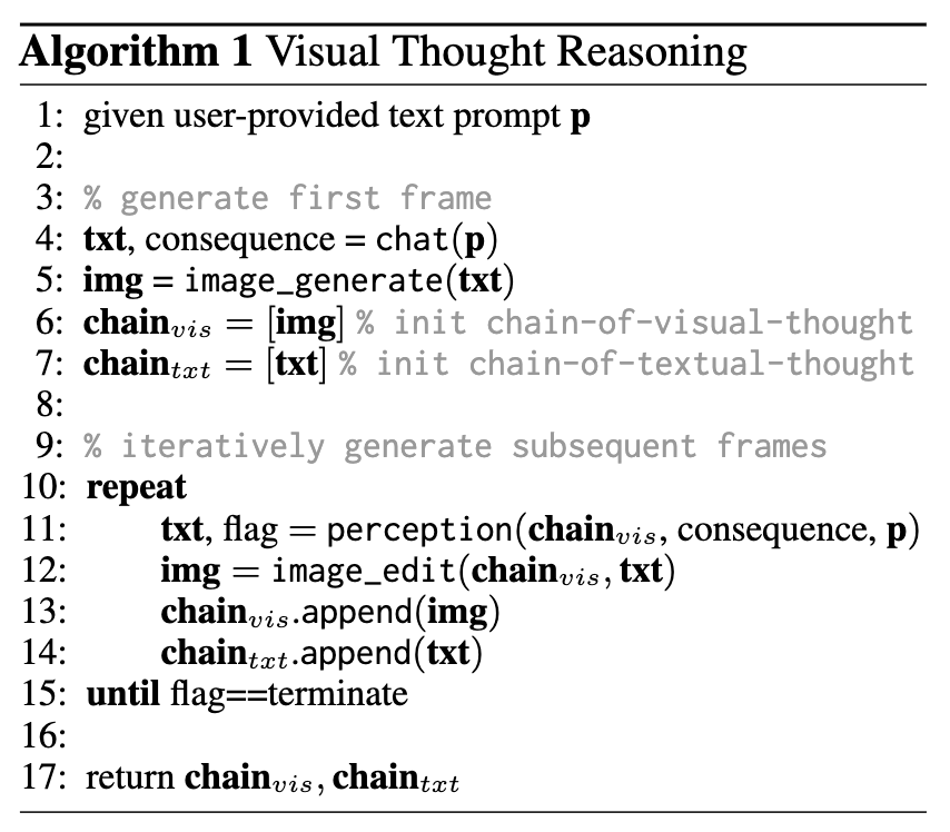 给定用户提供的视频生成文本提示 ,利用 GPT-4o 的强大多模态推理能力生成一系列图像,称为视觉思维链(Chain of Visual Thoughts),用于捕捉目标视频的关键时刻。视觉思维推理的步骤与定义在下算法 1 中列出。