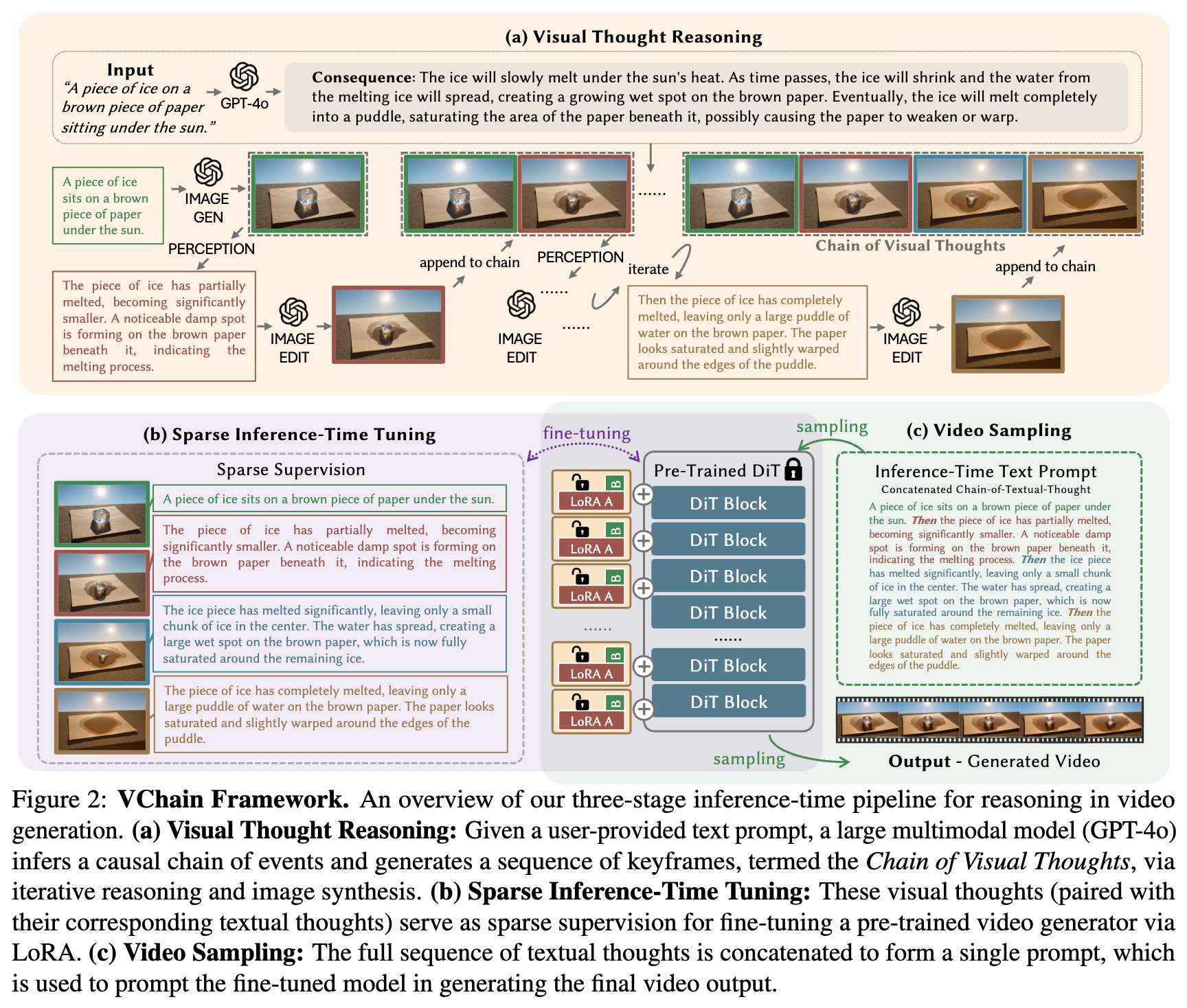 VChain:基于视觉思维链的视频生成推理框架 VChain提出了一种创新的视频生成方法,通过引入多模态大模型的视觉思维链(chain-of-visual-thought)来增强视频的逻辑连贯性。该框架的核心是利用GPT等大型模型推理生成具有因果关系的稀疏关键帧序列,作为视频生成的指导。在推理阶段仅对这些关键帧进行轻量化微调,显著提升了复杂动态场景的生成质量,如物体交互和状态转变。实验表明,VCh