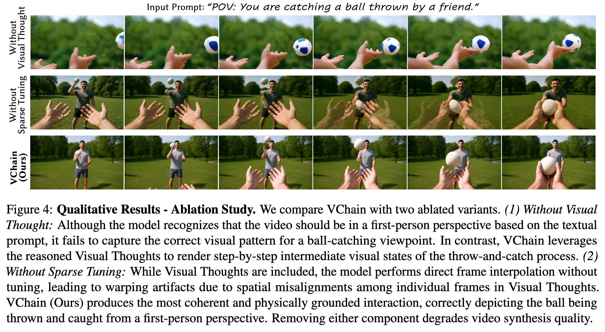 消融研究。 下图4展示VChain 与两个消融变体进行比较: 1)无视觉思维(Without Visual Thought):虽然该变体能够根据文本思维生成第一人称视角,但未能构想出正确的“接球”视觉模式。相比之下,本文的方法得益于直接“看到”视觉思维,从而实现对空间的准确理解与交互渲染。 2)无稀疏微调(Without Sparse Tuning):该变体直接利用视觉思维进行帧插值,但在尝试连接视觉思维关键帧的空间不对齐时,会出现变形伪影。VChain(我们的)生成了最连贯且符合物理规律的交互,准确描绘了投掷和接球的动作。移除任一组件都会导致视频合成质量下降。