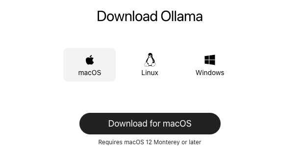 前往 Ollama 官网下载页面,可以看到对 macOS, Linux, Windows 的全面支持。我们选择并下载 macOS 版本,然后双击安装包完成安装。