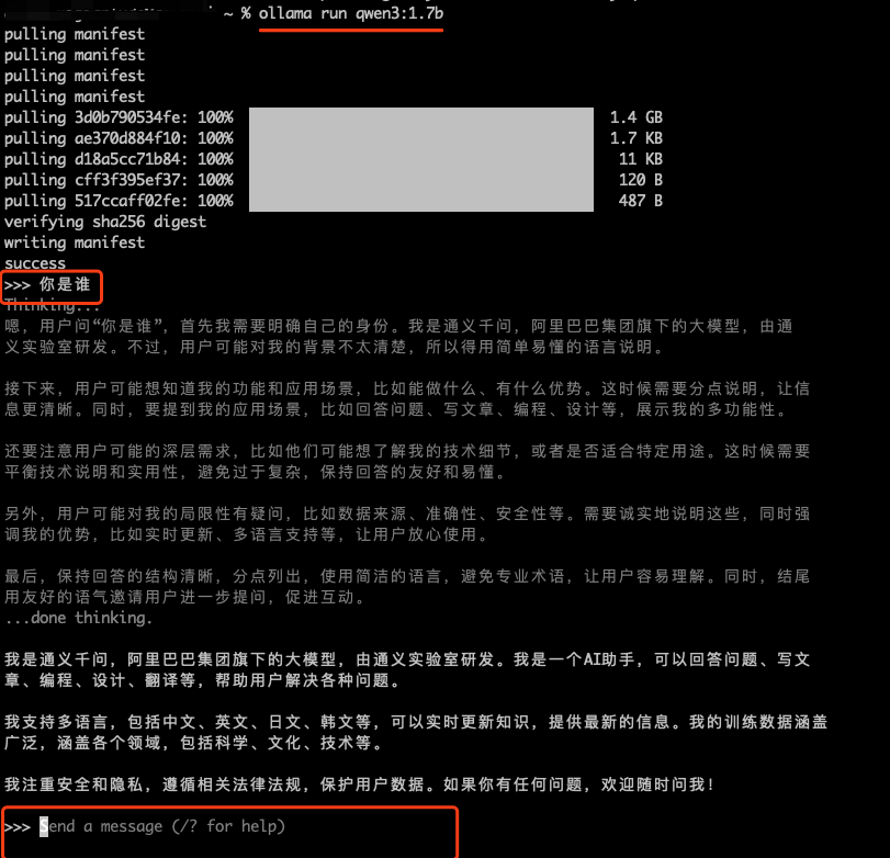 Ollama 会自动从官方库下载模型并启动。下载完成后,你就可以直接在终端与它对话了!