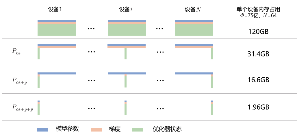 - 显存占用:4Φ +12N / Φ 字节(Φ 表示参数量,N 是设备数)。