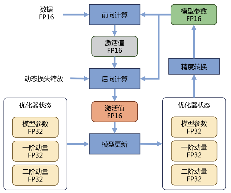 - 动态损失缩放:自动调整数值大小,避免溢出或下溢。