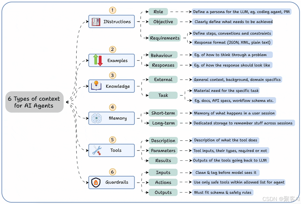 - 上下文工程:管理整个上下文状态,包括系统指令、工具、外部数据、历史消息等所有可能进入上下文窗口的信息。核心是“管理信息流”,专为多轮推理和长时程任务的AI Agent设计。