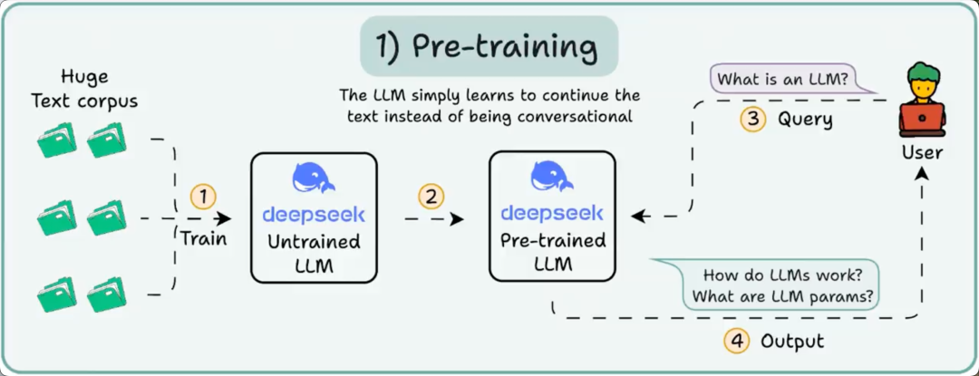 这一阶段通过在海量语料上训练 LLM 预测下一个 token,让它掌握语言的基本规律,从而吸收语法、世界知识等。