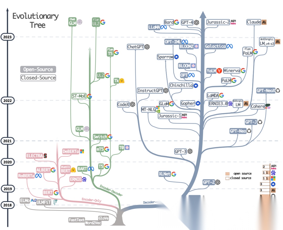 针对语言模型发展阶段,可以通过Yang等人整理的大语言模型进化树图,可以清楚地了解主流LM之间的关系。[1]