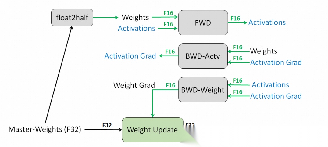 首先会拷贝一份FP32权重副本,然后权重转为FP16进行前向传播并计算loss后,通过FP16进行反向传播计算梯度,最后转换为FP32更新到FP32的权重上。