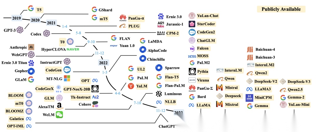 语言模型(LM)是一种基于自然文本预测词(Token)的机器学习方法,常见的架构包括GPT和BERT等。大语言模型通常指的是拥有亿级参数的神经网络语言模型,目前已经出现很多种能力强大的开源、闭源模型,如在下图中Zhao等人整理的大模型发展时间线中的模型。