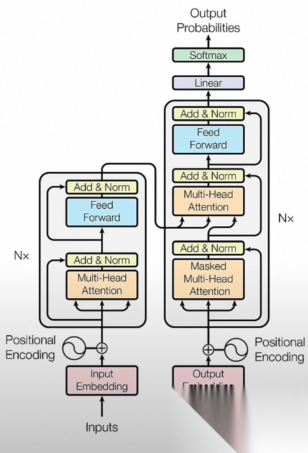 Transformer架构的左侧为Encoder结构,右侧为Decoder结构,如下: