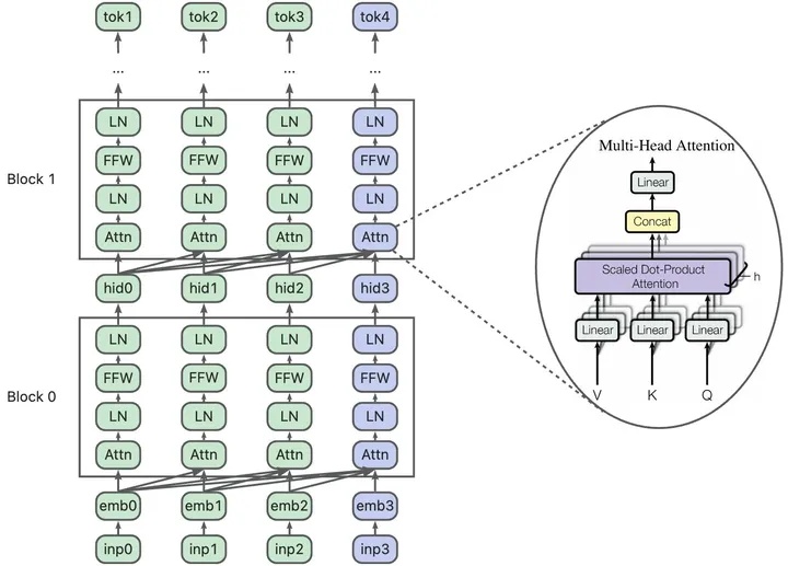 相比Transformer[2]中的Encoder结构其每个Block中减少了一个多头注意力MHA模块。