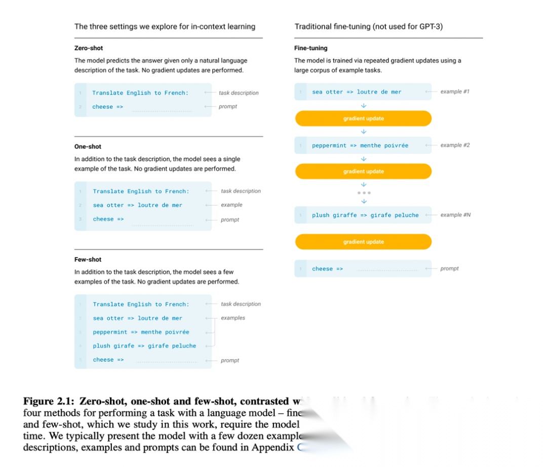 从GPT-2、GPT-3模型,开始采用直接在指令中进行样例学习的方式,以下三种直接在指令中进行的上下文小样本学习方式,而没有采取常规的小样本微调学习方式: