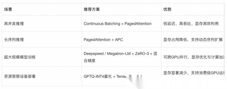 在实际的大模型落地场景时,通常需要在不同场景可以使用不同的技术方案组合,例如,如下不同场景的技术对比与选型建议: