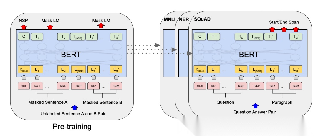 2)在微调阶段:BERT模型通过添加一个任务特定的头部(如分类器)并对整个模型进行端到端的监督训练,从而适应特定的NLP任务。