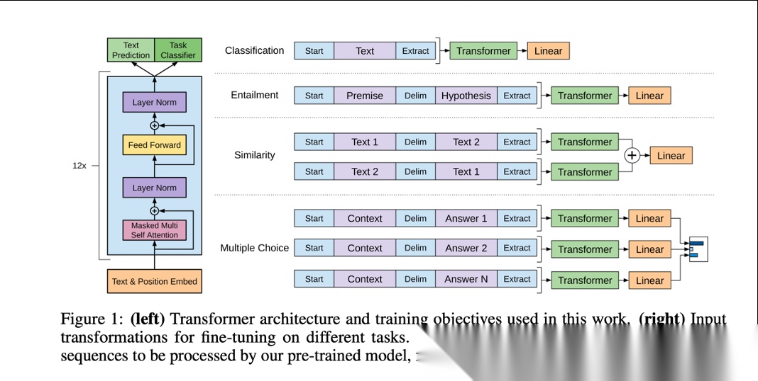 下图为GPT-1模型[3]的基础Transformer结构(左),以及在不同任务下的模型输入构造方式(右)。从图中可以看到其已经可以进行更多的处理任务。