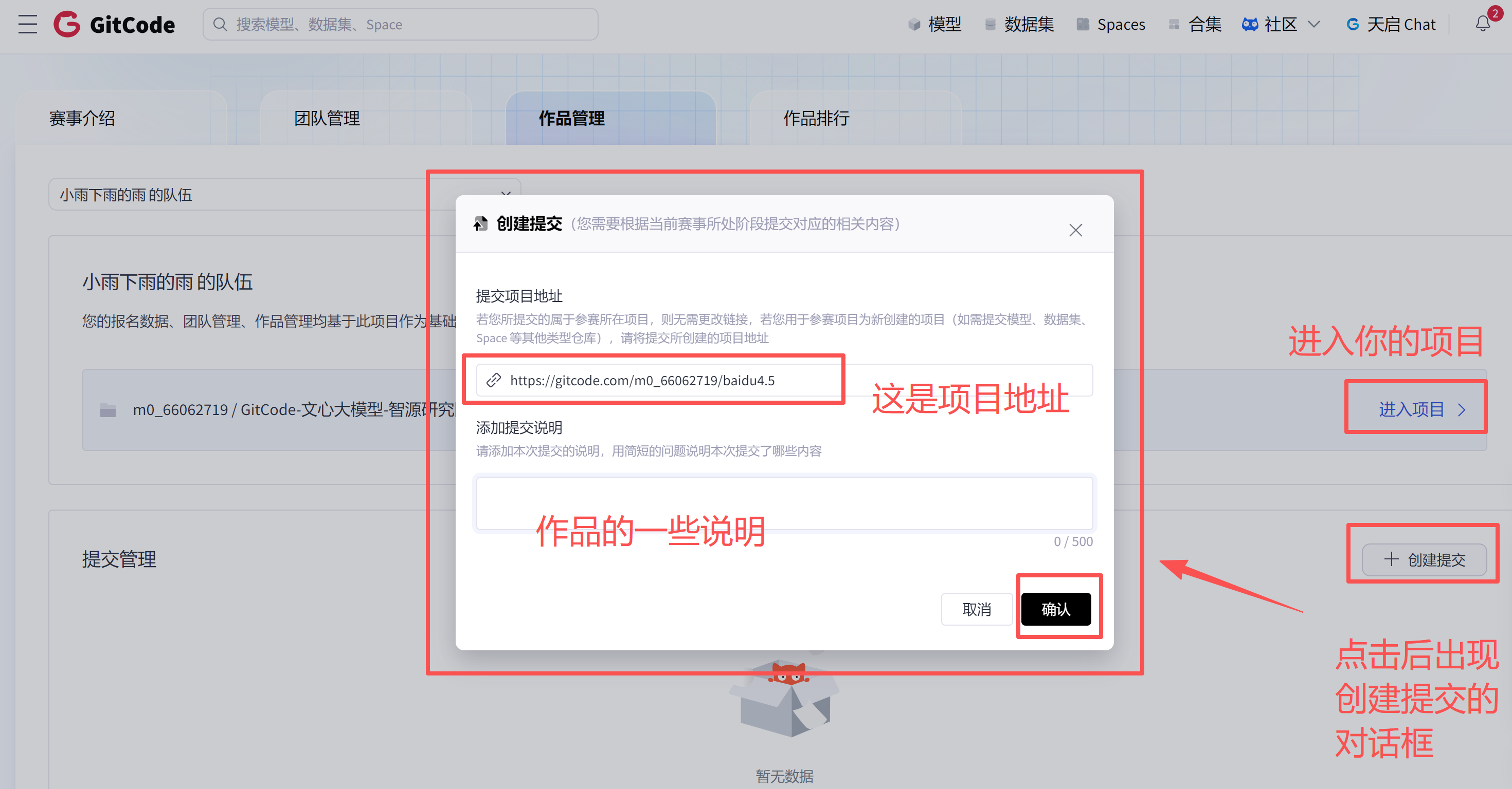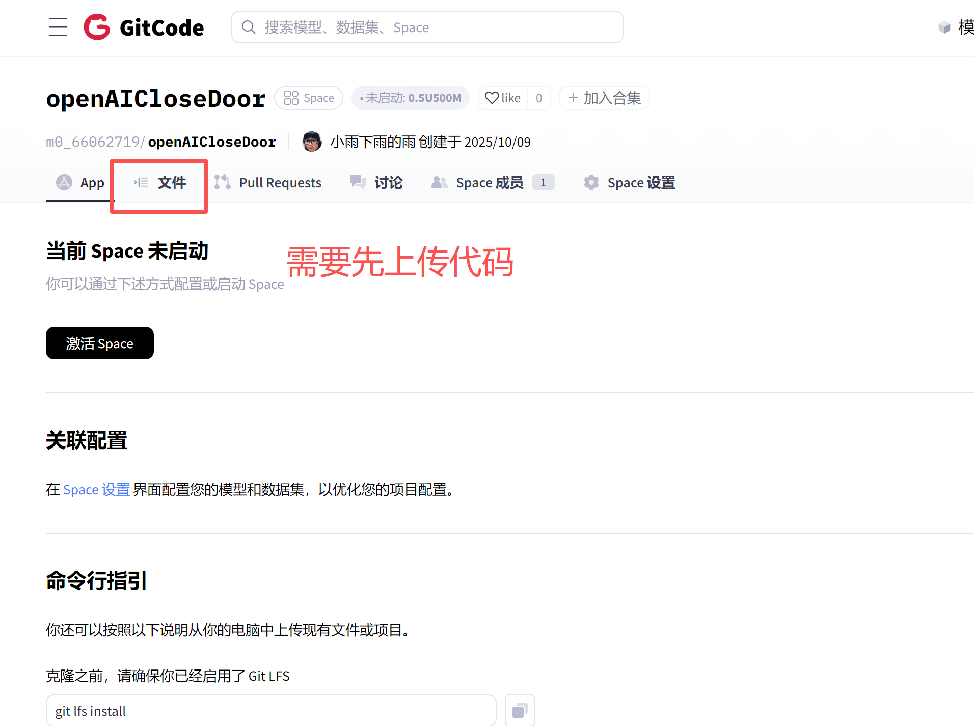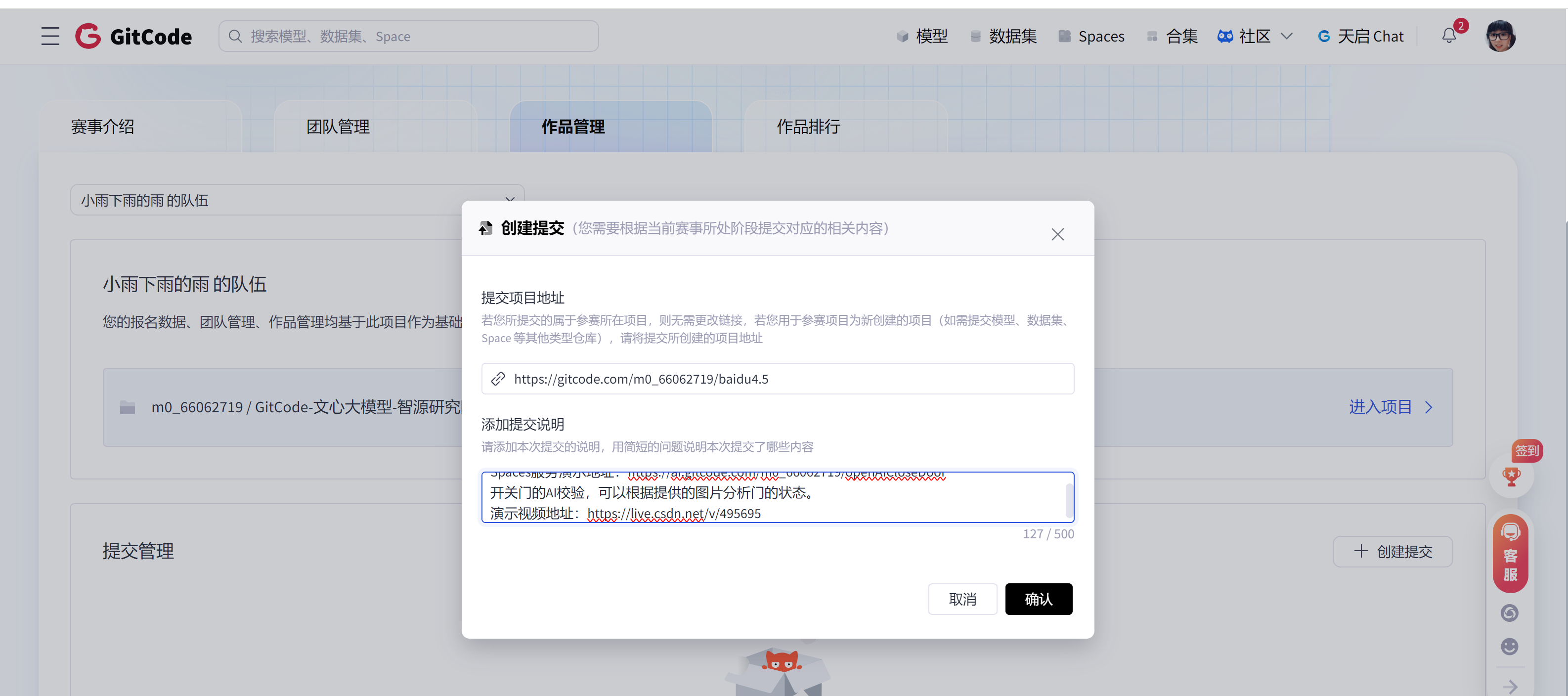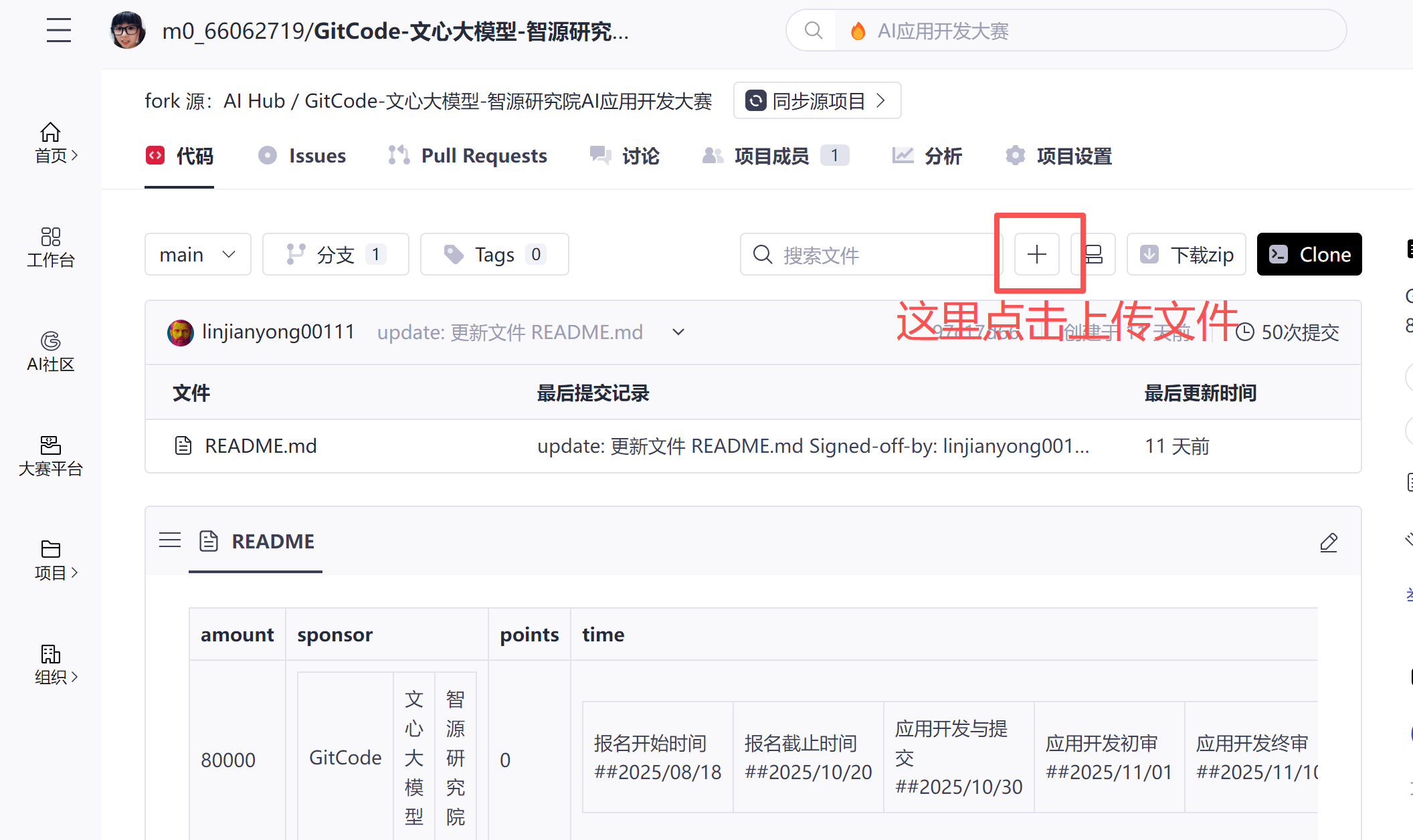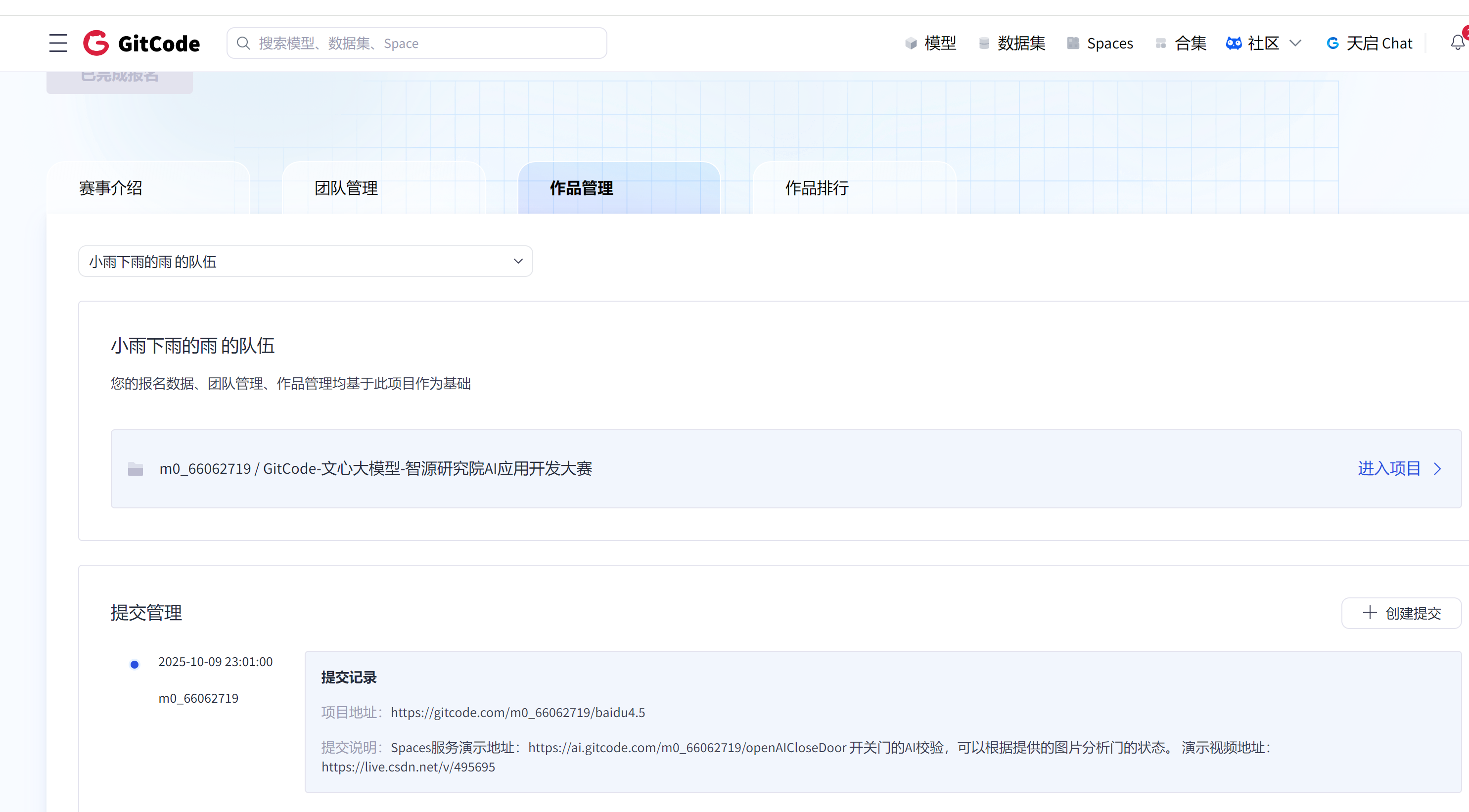 我们在gitCode的比赛地址中能看到我们的仓库,将代码上传上去,录制的视频也传上去。