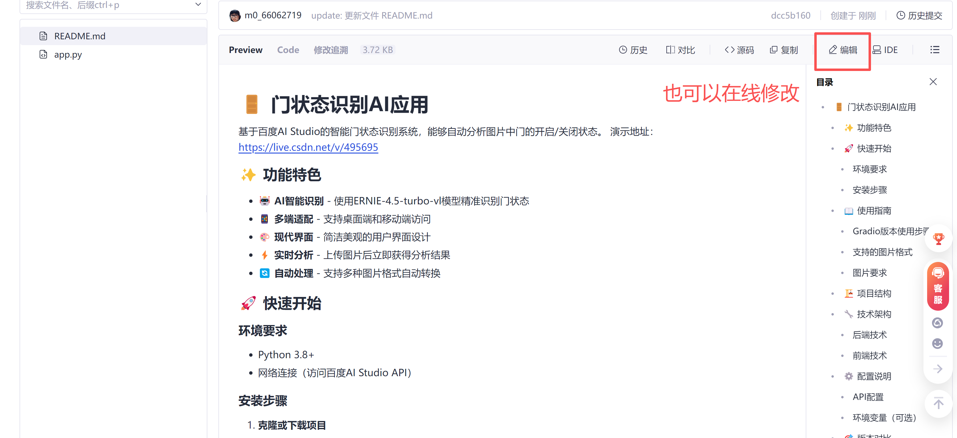 本文介绍了参加GitCode-文心大模型比赛的完整流程。比赛提供丰厚奖金和Token券奖励,使用百度文心4.5系列API。文章详细说明从报名、API使用到提交作品的步骤,包括基础文本处理、多模态图文分析、Web和Gradio界面开发等核心内容。重点讲解了如何利用文心4.5模型进行门状态识别,提供了完整的Python代码实现和部署方案。最后指导参赛者如何录制演示视频、上传代码到GitCode并完成作