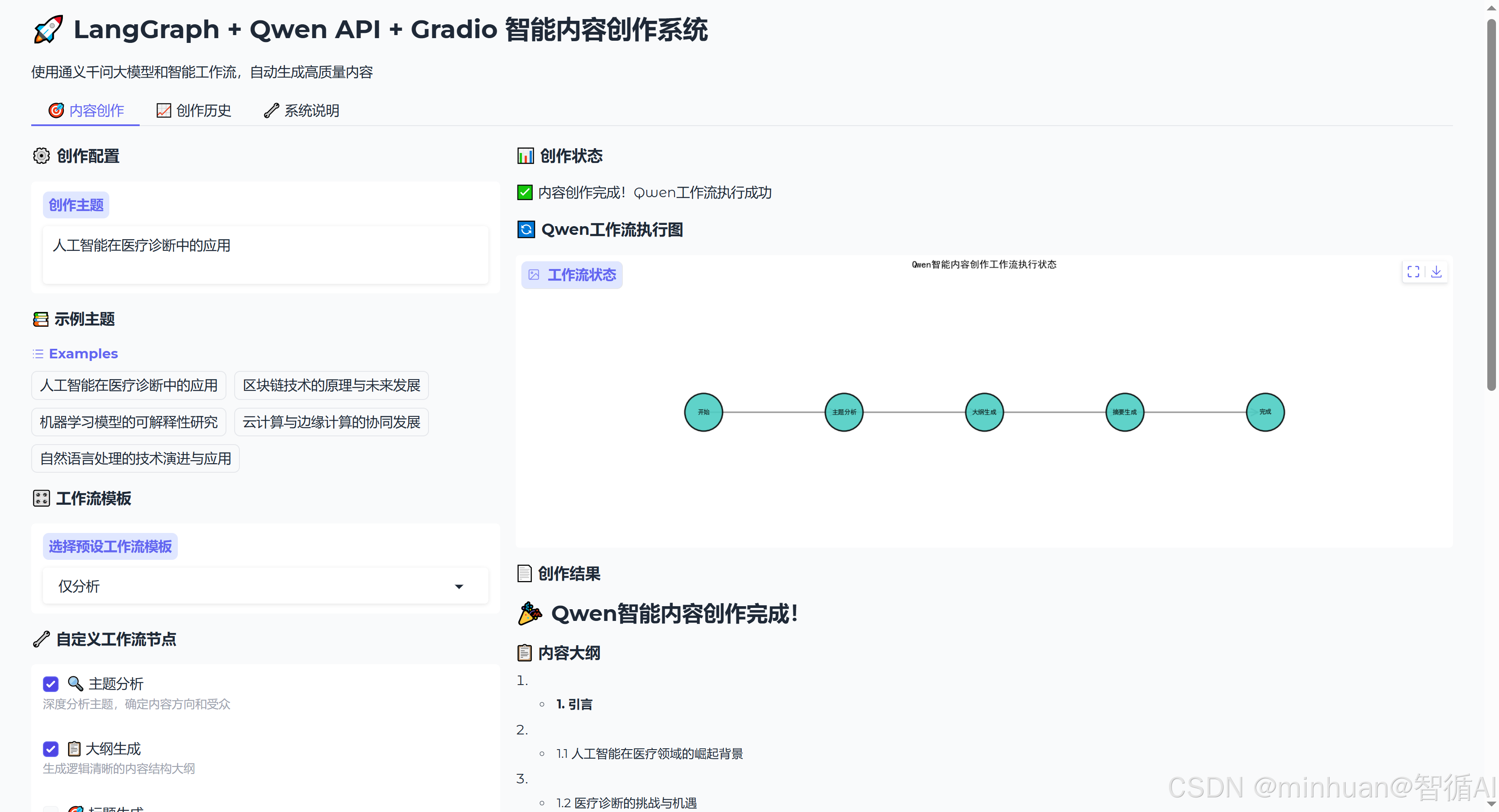 这是一个基于LangGraph工作流引擎、Qwen大模型和Gradio可视化界面的智能内容创作系统。系统深度集成先进的大语言模型服务,通过精心设计的提示词工程,确保生成内容的质量和相关性,并将传统的内容创作过程进行智能化重构,通过模块化设计和可视化交互,为用户提供从创意构思到完整内容产出的全流程解决方案,系统智能的将传统的内容创作过程分解为8个可配置的处理节点,通过模块化的工作流设计,实现了从主题输入到完整内容(包括文字和配图)的全自动化生成。