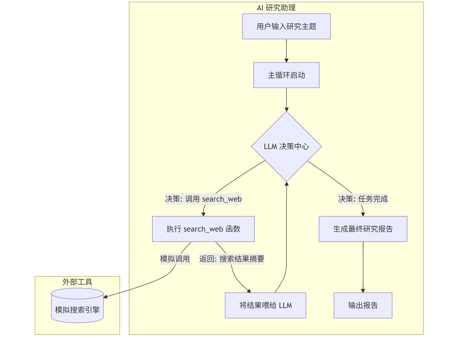 在编码前,我们先画出我们“AI研究助理”的详细工作流程图。