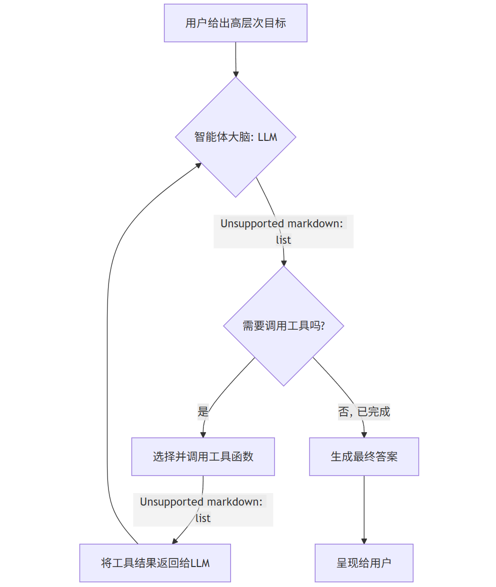 这种模式非常直接,但无法处理复杂、多步骤的任务。如果你让一个传统模型“帮我查一下天气,如果下雨就提醒我带伞”,它会无能为力,因为它没有“查天气”的工具,也没有“根据条件执行不同操作”的逻辑。
