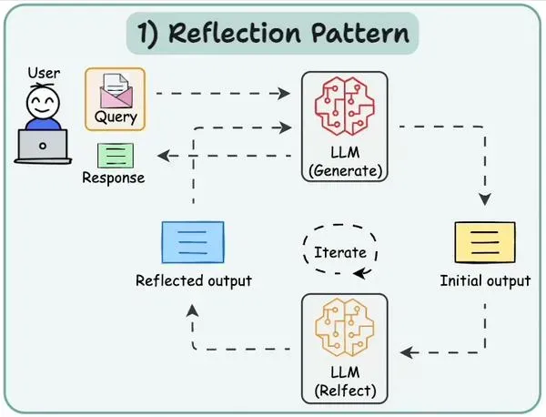 反思模式也映射了科学研究中的 “假设—实验—批判—修正” 循环。初步输出是 “假设”,反思是 “批判”,多轮迭代是 “修正”,最终输出是 “理论” 或 “结论”。