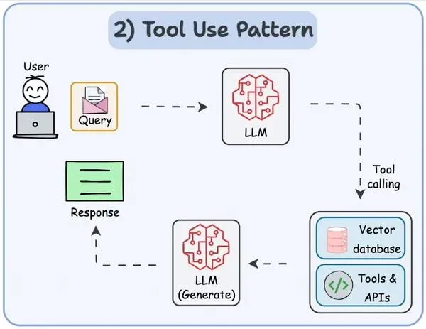 应用场景:工具模式主要用于 Agent 场景,扩展 LLM 的能力边界,调用外部工具 / API 扩展功能,解决自身无法直接完成的任务(如实时数据查询、代码执行),使其具备影响外部系统的能力。关键技术:工具集模块、执行模块、LLM 的 Function Call API、MCP 协议等。核心流程: