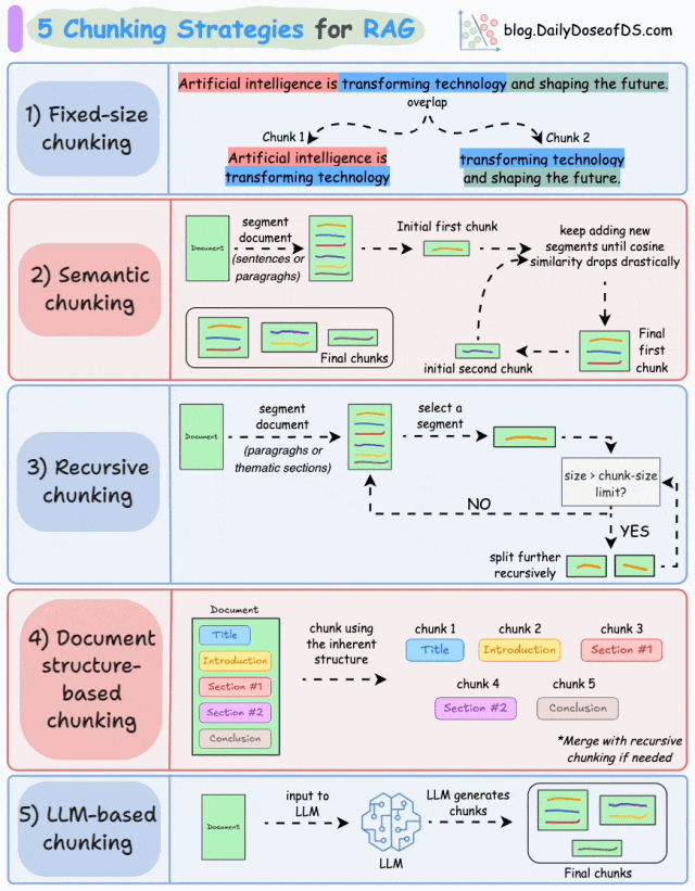 这五种策略从简单机械到复杂智能,各有优劣。在实际应用中,通常需要根据文档类型、应用场景和对成本与性能的权衡来选择最合适的策略,有时也会将多种策略组合使用。