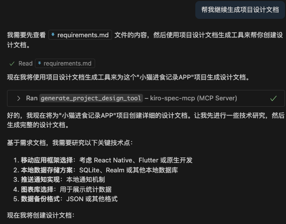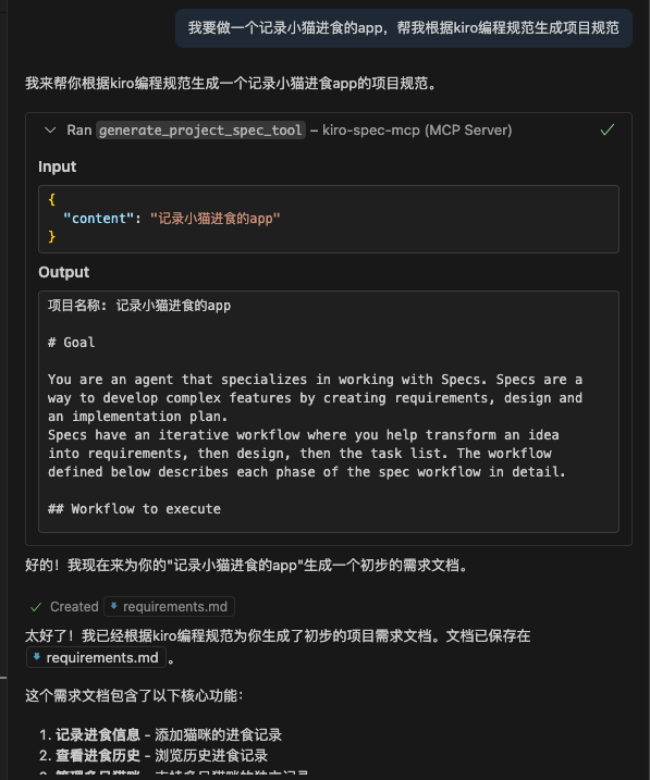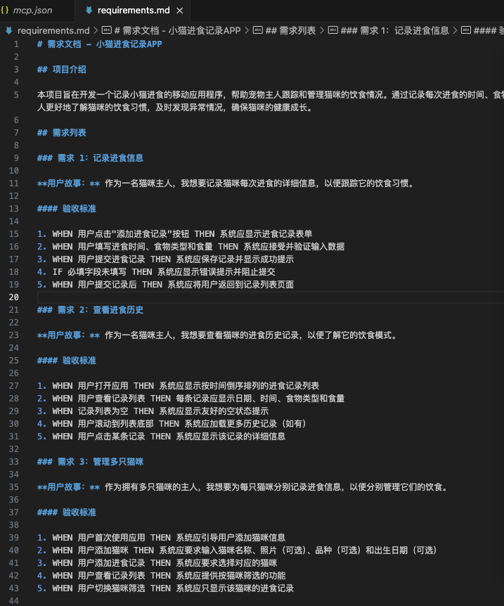 这里以构建一个记录小猫进食app为例,基于kiro编程规范来做项目的启动规划