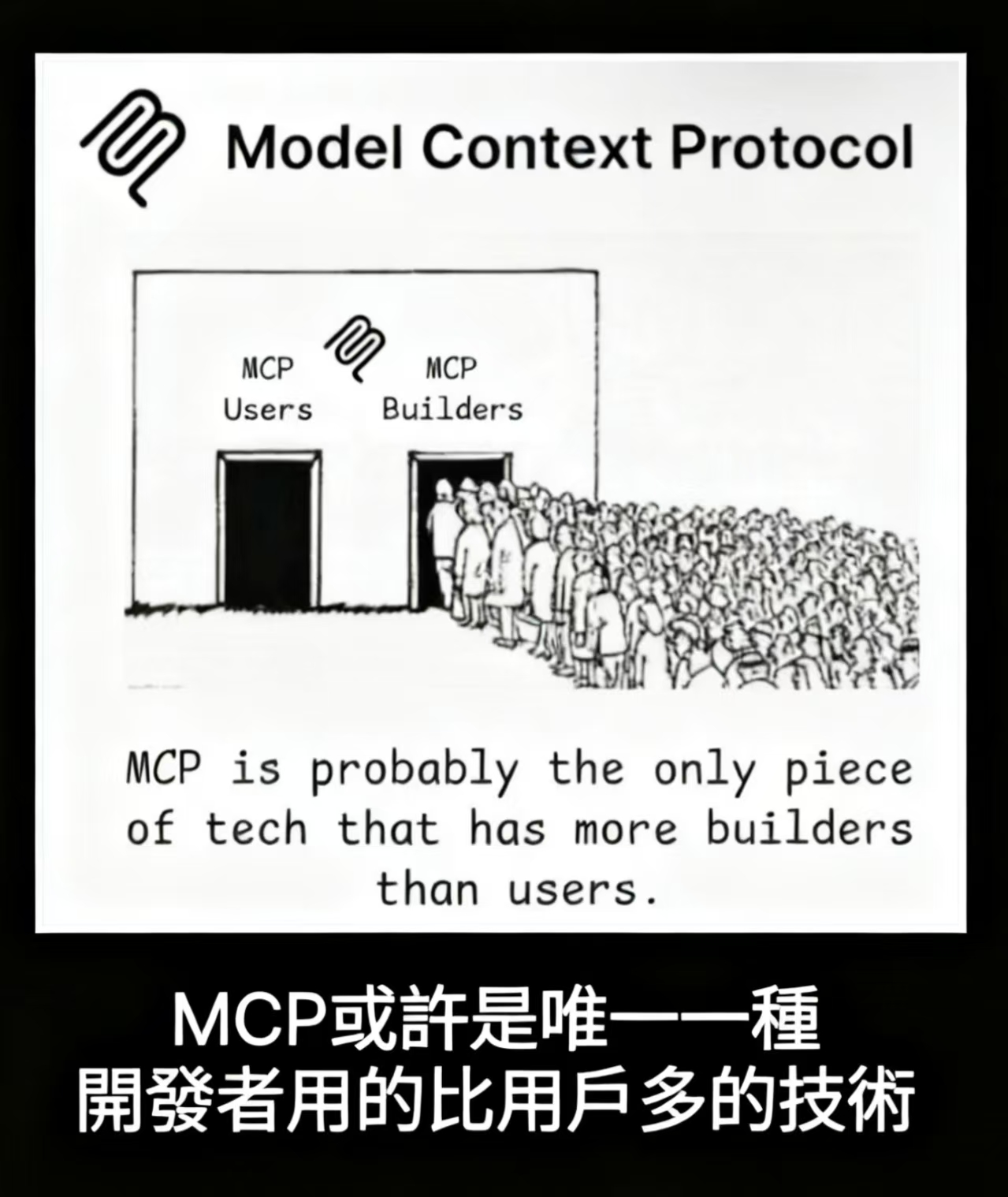 2025年,mcp大行其道,如这张梗图所示,Mcp似乎是开发者的一场狂欢。但是接触Mcp的这几个月,我认为Mcp不会是一场自嗨式的运动,Mcp 协议的出现拓展了llm的能力,Mcp以统一的接口规范协议,延展了llm的能力,如果llm是大脑,那基于mcp协议开发的工具就是四肢,就是感官器官,llm使用这些Mcp tool去获取更多的信息来作为上下文从而llm的能力被进一步发掘。换句话说,既然Mcp都这么多了,那再多一个你实现的Mcp的又咋样呢。(大佬高抬贵手,给俺的项目点个star,时间急,任务赶,有bug直接提我连夜修)
