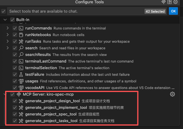 - vscode连接mcp,此时可以看见四个kiro编程规范的mcp tool