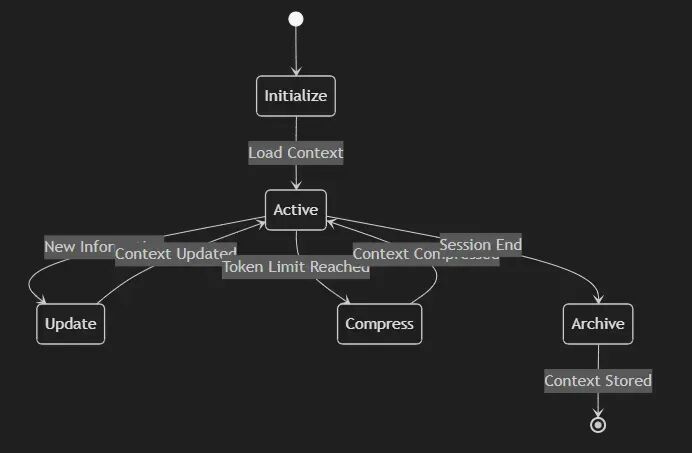 stateDiagram-v2 [*] --> Initialize Initialize --> Active: 加载上下文 Active --> Update: 新信息 Update --> Active: 上下文已更新 Active --> Compress: 达到Token限制 Compress --> Active: 上下文已压缩 Active --> Archive: 会话结束 Archive --> [*]: 上下文已存储