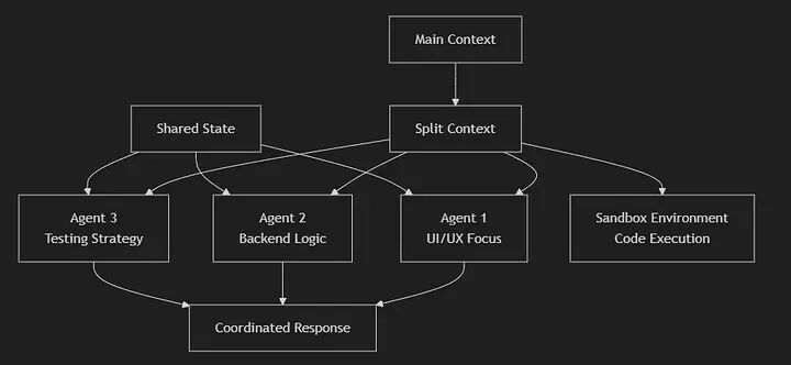 graph TD A[主上下文] --> B[拆分上下文] B --> C[智能体1<br/>UI/UX专注] B --> D[智能体2<br/>后端逻辑] B --> E[智能体3<br/>测试策略] B --> F[沙箱环境<br/>代码执行] G[共享状态] --> C G --> D G --> E C --> H[协调响应] D --> H E --> H