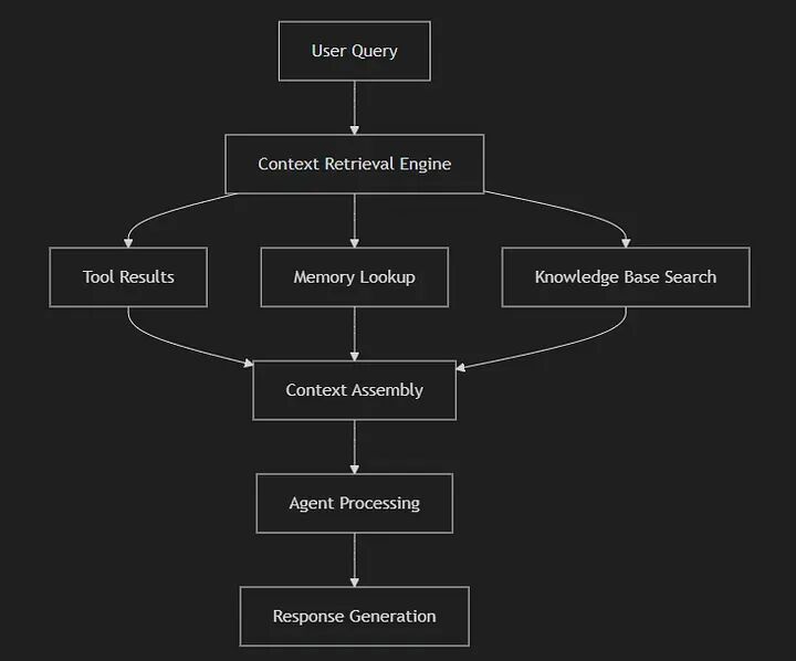 graph TD A[用户查询] --> B[上下文检索引擎] B --> C[工具结果] B --> D[记忆查找] B --> E[知识库搜索] C --> F[上下文组装] D --> F E --> F F --> G[智能体处理] G --> H[响应生成]