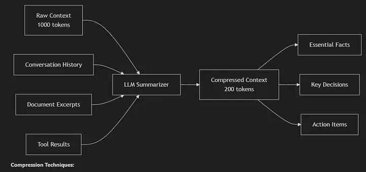 graph LR A[原始上下文<br/>1000 tokens] --> B[LLM摘要器] B --> C[压缩后上下文<br/>200 tokens] A1[对话历史] --> B A2[文档摘录] --> B A3[工具结果] --> B C --> D[关键事实] C --> E[重要决策] C --> F[行动项]