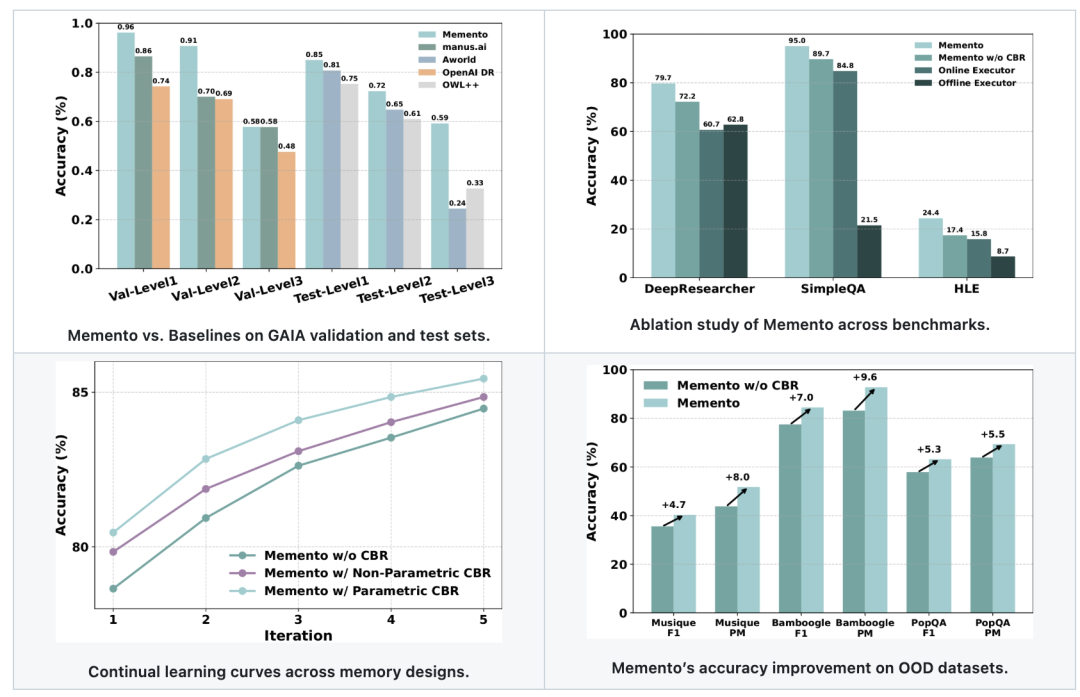 - 无需更新LLM权重:Memento 将持续学习重新定义为基于记忆的在线强化学习,通过记忆增强的马尔可夫决策过程(MDP)实现。神经案例选择策略引导动作,经验通过高效的读写操作存储和重用。