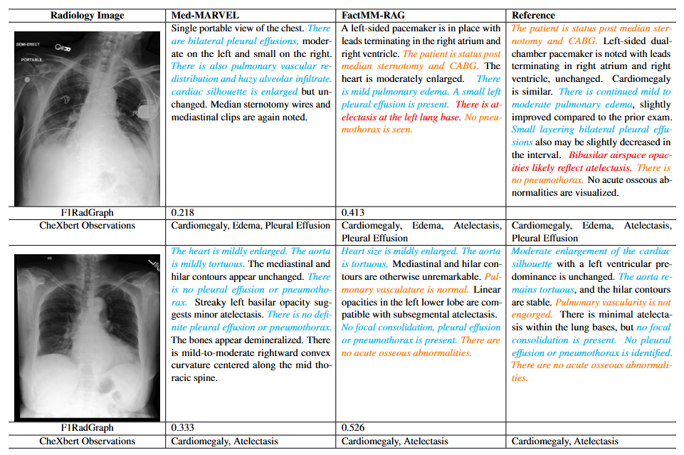 - 准确性(F1分数): 在2025年发表的一项研究中,一种用于生成放射学报告的事实感知多模态RAG方法,在语言生成和放射学特定指标的F1分数上分别实现了6.5%和2%的显著提升。