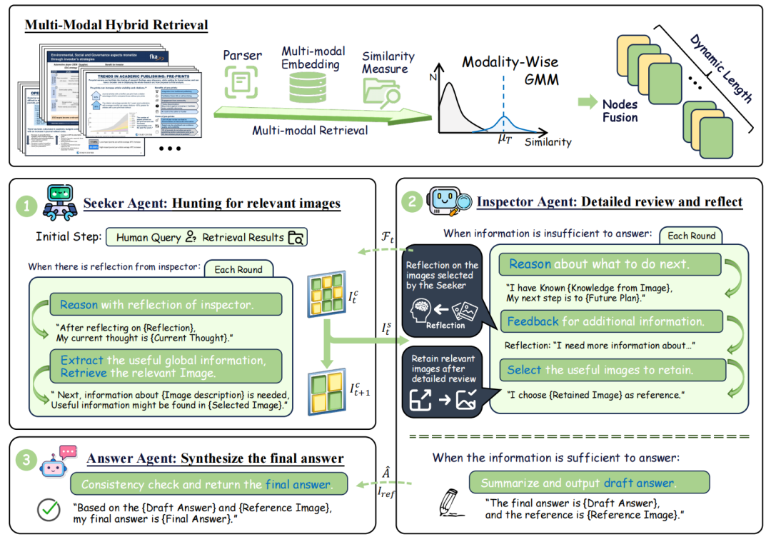 - 多智能体协作机制: 框架内包含多个智能体,如负责初步信息筛选的“探索者”(Seeker)、负责审查和验证信息的“检查员”(Inspector)以及负责整合信息并生成最终答案的“回答者”(Answer)。它们通过一个“探索-总结-反思”(Explore, Summarize, and Reflect)的迭代循环进行协作,不断修正和深化对问题的理解 。