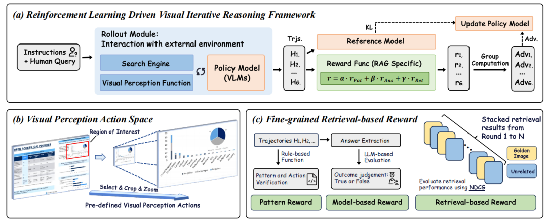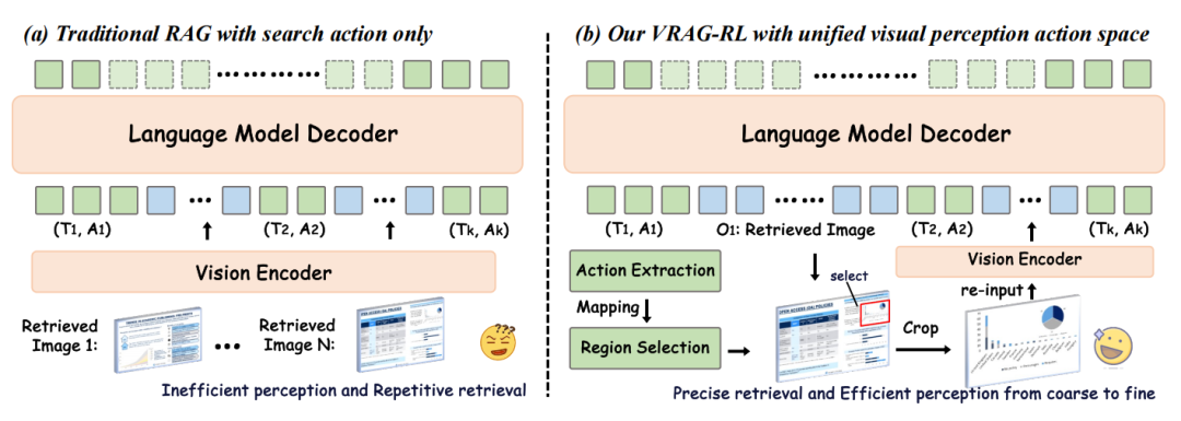 如果说ViDoRAG通过“流程再造”提升了RAG的推理能力,那么 《VRAG-RL: Empower Vision-Perception-Based RAG for Visually Rich Information Understanding via Iterative Reasoning with Reinforcement Learning》(arXiv:2505.22019) 则通过引入“学习机制”,让RAG系统学会了如何做出更优的决策 。