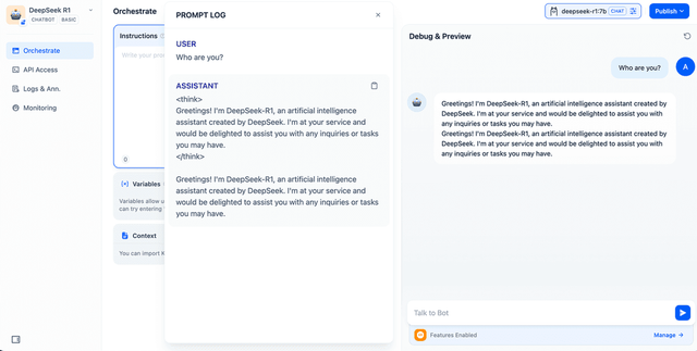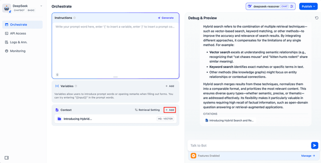 创建空白应用 → 选择“聊天机器人”类型 → 指定 DeepSeek 模型 → 测试交互。