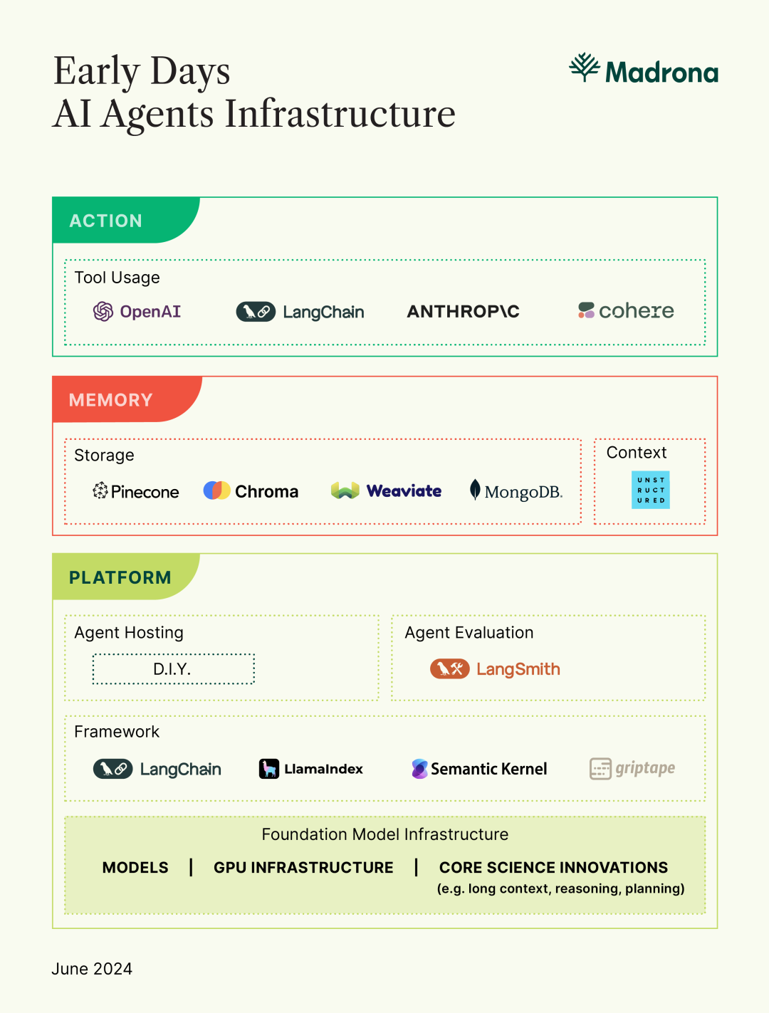 如今,许多 Agent 几乎完全垂直集成,没有太多托管基础设施。这意味着:Agent 的自管理云主机、用于内存和状态的数据库、从外部源摄取上下文的连接器,以及称为 Function Calling、Tool Use 或 Tool Calling 的功能来使用外部 API。一些开发者使用 LangChain 等软件框架(特别是其评估产品 Langsmith)将这些组合在一起。这个技术栈今天效果最好,因为开发者正在快速迭代,感觉他们需要端到端控制其产品。